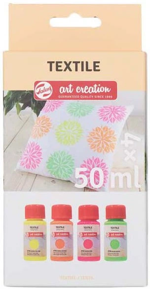 Zestaw neonowych farb tekstylnych Talens Art Creation do dekoracji tkanin z lekkich materiałów zawierających co najmniej 50% bawełny. Farby są przeznaczone do stosowania na odzieży, torbach, poduszkach, zasłonach i innych przedmiotach tekstylnych i nakłada się je pędzlem, gąbką lub innymi narzędziami do tworzenia. Po nałożeniu należy pozostawić je do wyschnięcia na około 30 minut, a następnie utrwalić zwykłym żelazkiem (w trybie dla bawełny) z ochronną warstwą papieru między tkaniną a stopą żelazka, po czym ozdobione wyroby można prać w temperaturze do 40 °C i suszyć w suszarce bębnowej. Zestaw zawiera cztery kolory po 50 ml w jasnych neonowych odcieniach: żółty, pomarańczowy, różowy i zielony, co pozwala tworzyć nasycone, widoczne rysunki i wzory na tekstyliach, nadając produktom indywidualny i kreatywny charakter.