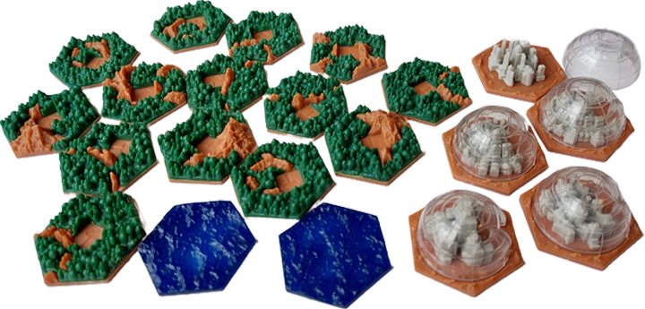 Завдяки просторовим елементам з Big Storage Box області на ігровому полі можуть бути гідно представлені, додаючи грі атмосфери. Але що з унікальною картою Amazonis Planitia, яка містить додаткові плитки (зокрема, вимагає більшої кількості океанів)? З Terraforming Mars: Amazonis Planitia 3D Tiles ви можете спати спокійно – це естетичне розширення доповнить вашу колекцію необхідними елементами. Набір містить 2 океани, 5 міст зі спеціальними куполами та 14 зелених зон.