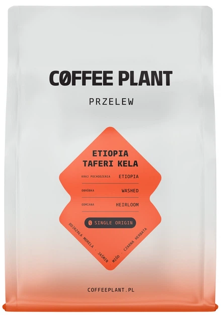Ziarnista kawa specialty z Etiopii, wypalana w Polsce przez palarnię Coffee Plant, pochodzi z farmy Taferi Kela w regionie Sidamo, położonej na wysokości 1900–2100 m n.p.m. Ziarna 100% Arabica z lokalnych odmian Heirloom zostały poddane obróbce washed (fully washed), co zapewnia naparowi wyjątkową czystość, lekkość i elegancki charakter. Jasny stopień palenia idealnie podkreśla subtelny, herbaciany profil oraz niską kwasowość kawy.