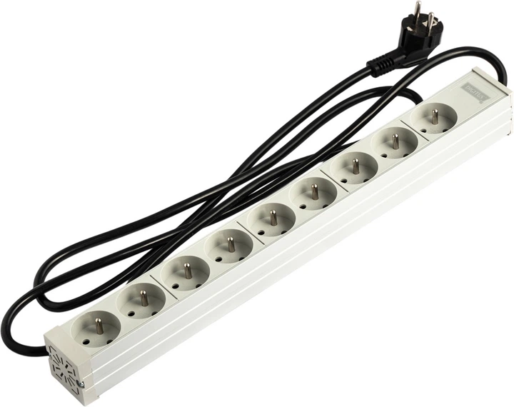 Przedłużacz wyposażony jest w 9 gniazdek typu F z uziemieniem, przystosowanych do napięcia 250 V i prądu do 16 A, co pozwala na podłączenie aktywnego sprzętu sieciowego, serwerów i urządzeń pomocniczych. Brak wyłącznika zapewnia stałe zasilanie wszystkich gniazdek, co jest wygodnym rozwiązaniem dla systemów, które nie wymagają ręcznego sterowania zasilaniem.