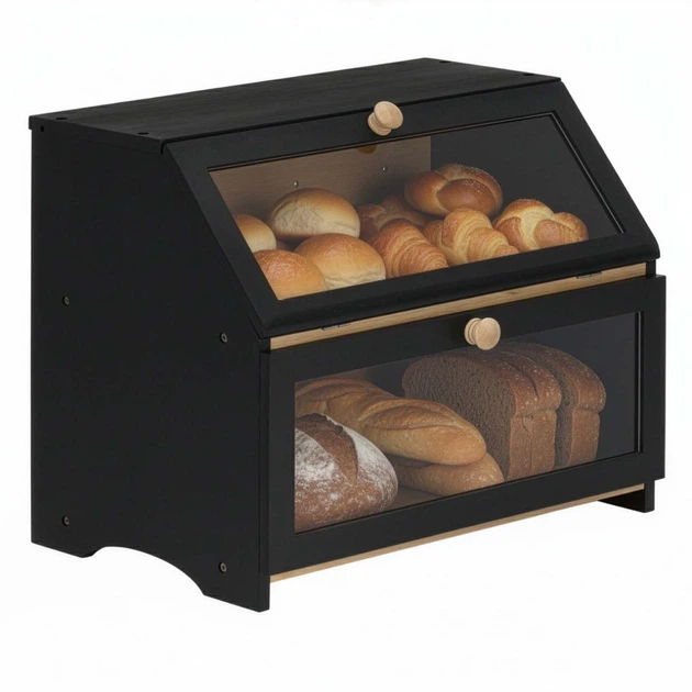 Elegancki, dwupoziomowy, bambusowy chlebak w kolorze czarnym – połączenie funkcjonalności i designuDwupoziomowy, bambusowy chlebak w kolorze czarnym to stylowe i praktyczne rozwiązanie do nowoczesnej kuchni. Łączy w sobie estetyczny wygląd z wysoką funkcjonalnością i trwałością, dzięki czemu stanowi niezawodne akcesorium kuchenne na długie lata.