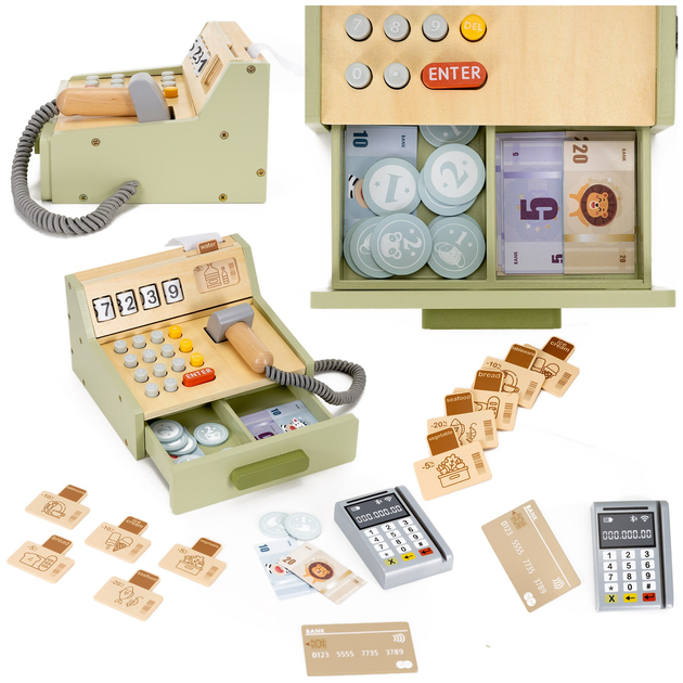 Różnorodne elementy zestawu — funkcjonalne przyciski, wysuwana szuflada, pieniądze oraz terminal — sprawiają, że zabawa jest dynamiczna i realistyczna. Karta płatnicza zapoznaje dzieci z zasadami płatności bezgotówkowych, a banknoty pomagają ćwiczyć liczenie i rozumienie wartości towarów. Solidna drewniana konstrukcja zapewnia stabilność, trwałość oraz przyjemne wrażenia dotykowe.