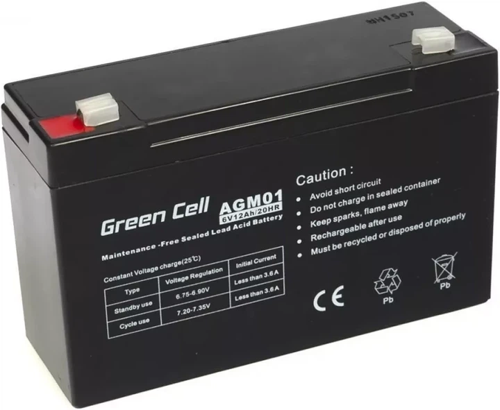 Акумулятор AGM Green Cell напругою 6 В виготовлений з високоякісних матеріалів і придатний як для буферної, так і для циклічної роботи. Акумулятор базується на технології AGM, що означає, що електроліт вбирається в сепаратор зі скловолокна, що унеможливлює його витік. Завдяки цьому акумулятор може працювати в багатьох положеннях, не тільки у вертикальному. Це чудова, значно безпечніша альтернатива свинцево-кислотним акумуляторам.