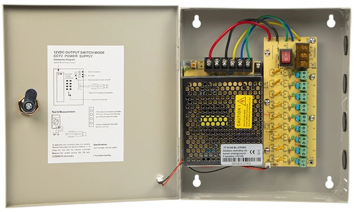 Zasilacz centralny kamer 9‑kanałowy BL-CPS9C przeznaczony do zasilania systemów monitoringu CCTV. Urządzenie zapewnia stabilne napięcie 12 V i całkowity prąd do 10 A. Posiada zabezpieczenia przed zwarciem i przeciążeniem, a regulowany zakres wyjściowy umożliwia zasilanie urządzeń na odległość do 200 m. Idealny do domowego lub profesjonalnego systemu kamer.