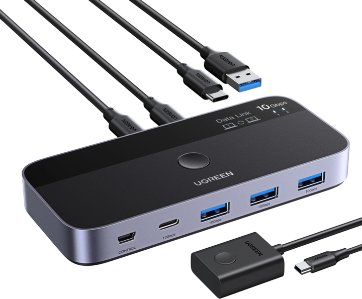 Zewnętrzny przycisk pozwala przełączać się między komputerami jednym ruchem, co poprawia ergonomię pracy przy biurku.