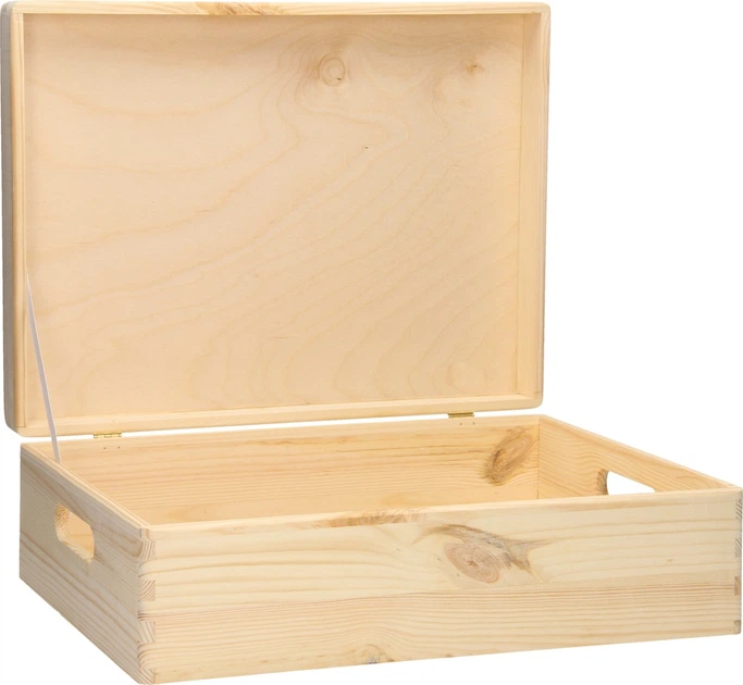 Po bokach znajdują się 2 wyprofilowane uchwyty, które ułatwiają przenoszenie skrzyni. Naturalna powierzchnia drewna pozwala na dowolną personalizację – skrzynię można malować, lakierować, bejcować lub ozdabiać techniką decoupage.