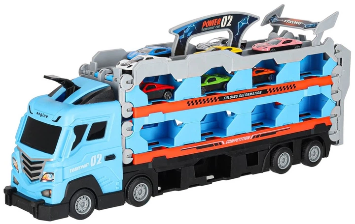 Niebieska laweta to zabawka wspierająca rozwój motoryki małej dzieci. Po rozłożeniu zmienia się w tor o długości 210 centymetrów, po którym może ścigać się 8 dołączonych do zestawu aut. Wbudowana wyrzutnia umożliwia dynamiczne wystrzeliwanie aut. Po zabawie wszystkie pojazdy można łatwo załadować z powrotem na lawetę, dzięki czemu zabawka zajmuje mało miejsca.