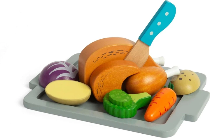 Drewniany zestaw do zabawy "Pieczony Obiad" firmy Bigjigs Toys zachęca do kreatywnego odgrywania ról i kształtowania zdrowych nawyków żywieniowychCiesz się chrupiącymi marchewkami, świeżymi brokułami, chrupiącymi ziemniakami i soczystym kurczakiem z zestawem do zabawy "Pieczony Obiad"! Zestaw inspirowany zabawą w prawdziwym życiu zawiera drewniany nóż, którym dzieci mogą kroić udka i pałki kurczaka, przymocowany rzepem dla łatwego krojenia. Zawiera również drewnianą tackę, dzięki której mali kucharze mogą serwować przygotowane z miłością posiłki rodzinie i przyjaciołom.