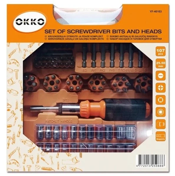 Wkrętak 1/4", magnetyczny uchwyt bitów 60 mm, bity wkrętakowe o długości 25 mm: PH0, PH1, PH2, PH3, TX10, TX15, TX20, TX25, TX27, TX30, TX40; TX45, SL3, SL4, SL5, SL6, SL7, SL8, S0, S1, S2, S3; bity wkrętakowe o długości 50 mm: PH1, PH2, PH3, SL4, SL5, SL6; głowice 1/4": 4 mm, 4,5 mm, 5 mm, 5,5 mm, 6 mm, 7 mm, 8 mm, 9 mm, 10 mm, 11 mm, 13 mm