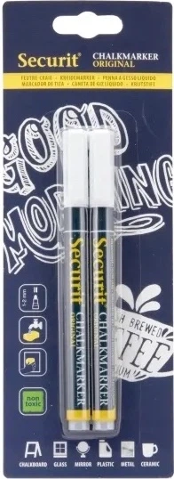 Zestaw Securit zawierający 2 markery kredowe z płynnym białym tuszem kredowym i cienką końcówką (1–2 mm). Markery są przeznaczone do pisania po nieporowatych powierzchniach, takich jak tablice magnetyczne, szkło, metal, plastik i inne gładkie powłoki.