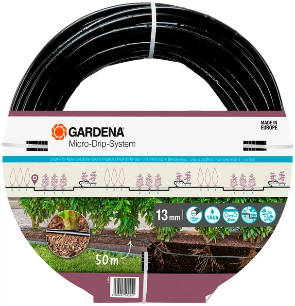 Linia kroplująca Gardena Micro Drip System o długości 50 m to gotowy do użycia system nawadniający z wbudowanymi kroplownikami, przeznaczony do równomiernego i oszczędnego nawadniania długich rabat, żywopłotów i rzędów roślin. Kroplowniki rozmieszczone są co 30 cm i dostarczają stabilną ilość wody 1.6 l/h, zapewniając precyzyjne nawilżanie strefy korzeniowej bez strat i parowania. Rura charakteryzuje się zwiększoną odpornością na promieniowanie ultrafioletowe i ciśnienie, nie wygina się i zachowuje swój kształt podczas pracy. System działa jako element systemu Micro Drip, łatwo podłącza się go do elementów startowych i pozwala na stworzenie efektywnego, zautomatyzowanego i oszczędnego nawadniania w danym miejscu.