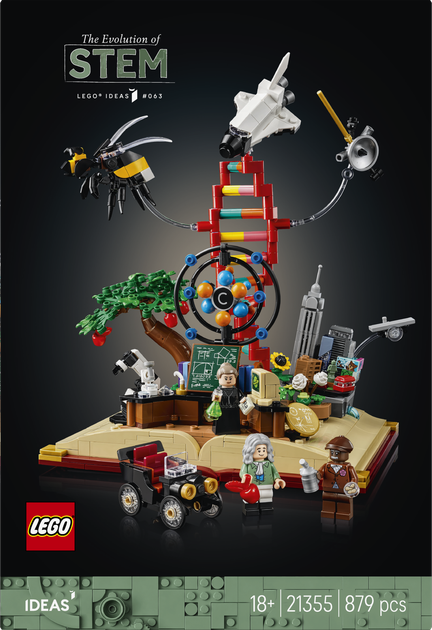 Відкрийте створену з кубиків книгу про еволюцію STEM (наука, технології, інженерія і математика) з цією колекційною моделлю для дорослих серії LEGO Ideas (21355). Науковий подарунок для жінок, чоловіків і поціновувачів історії, що надихає, має основу, що складається з кубиків, у формі відкритої книги, увінчану мінімоделями, які відображають історичні інновації. Створіть перший автомобіль і домашній компʼютер, космічний зонд НАСА «Вояджер» із золотою платівкою на борту для будь-якої позаземної форми життя, яка може його знайти, і безліччю іншого. Поверніть регулятор, щоб 3D-модель атома вуглецю злітала вгору, а ланцюжок ДНК обертався.