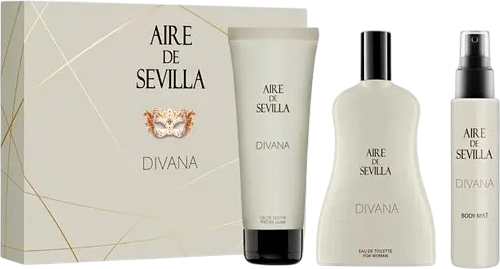 Zestaw damski Aire De Sevilla Divana to elegancki prezent dla osób ceniących świeże, kwiatowo-drzewne zapachy z ciepłą, ambrową nutą. W zestawie: woda toaletowa 100 ml, żel pod prysznic 100 ml i mgiełka do ciała 50 ml.