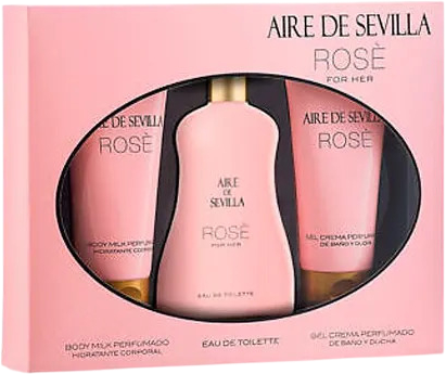 Zestaw dla kobiet Aire De Sevilla Rose to elegancki prezent dla osób ceniących delikatne, kwiatowo-drzewno-ambrowe zapachy. W zestawie: woda toaletowa 100 ml, krem do ciała 100 ml i żel pod prysznic 100 ml.