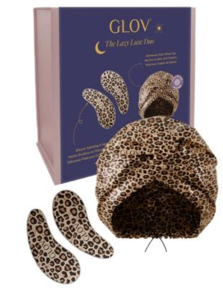 Skład zestawu: Satynowa czapka do spania, wzór lamparta - Glov Glamorous Satin Sleep Cap, 1 szt. + Wielokrotnego użytku płatki na oczy - Glov Infinity Eye Patches, 2 szt.