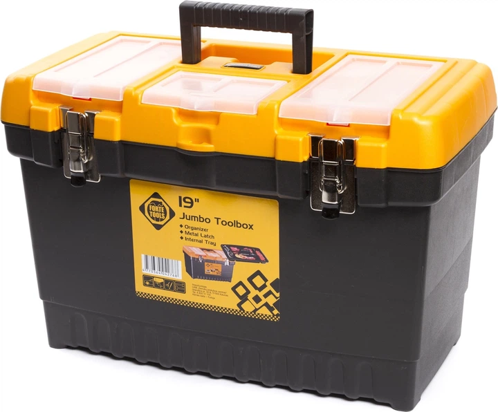 Przenośna plastikowa skrzynka narzędziowa Forte Tools, przeznaczona do przechowywania i transportowania narzędzi ręcznych, wyrobów metalowych oraz akcesoriów. Posiada wyjmowaną tacę, organizery na drobne elementy, na górze — uchwyt do przenoszenia, a z przodu — zatrzaski do bezpiecznego zamykania. Taka skrzynka idealnie nadaje się do warsztatów, garaży czy użytku domowego na narzędzia.