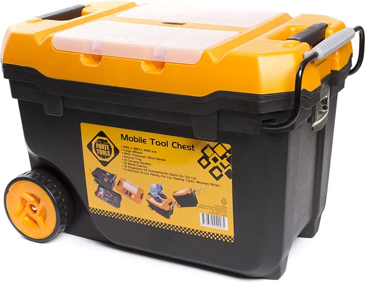 Forte Tools TK-28 to wytrzymała plastikowa skrzynka narzędziowa o dużym rozmiarze. Na 2 kołach, przeznaczona do przechowywania i transportowania narzędzi ręcznych oraz drobnych elektronarzędzi, akcesoriów, elementów mocujących itp. Zapewnia ochronę przed uszkodzeniami mechanicznymi, a jednocześnie posiada dużą pojemność przestrzeni wewnętrznej do organizacji narzędzi w warsztacie, garażu czy na placu budowy.