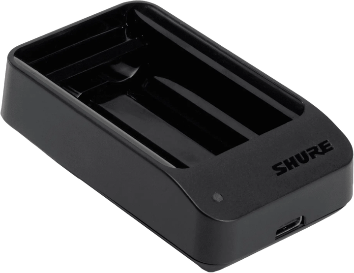 Ładowarkę USB do pojedynczego akumulatora można zasilać z sieci prądu zmiennego i portu USB, co umożliwia ładowanie jednego akumulatora litowo-jonowego Shure SB903 przeznaczonego do użytku z cyfrowymi nadajnikami bezprzewodowymi SLX-D.