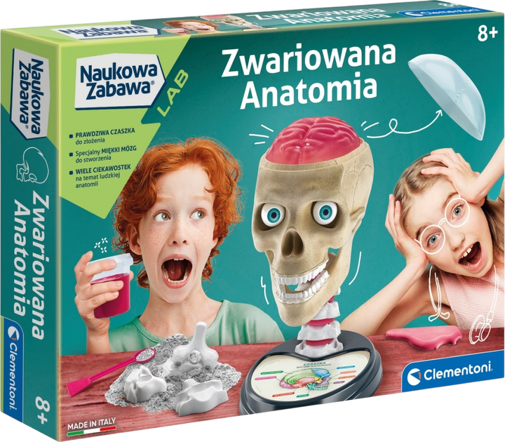 Szukasz przyjemnego sposobu na naukę o anatomii człowieka? Zwariowana anatomia jest tutaj to idealne rozwiązanie dla tych, którzy chcą odświeżyć swoje podejście do nauki lub tych, którzy dopiero zaczynają swoją naukową podróż. Wyposażony w niesamowite materiały i elementy zestaw, sprawi że złożenie tego modelu ludzkiej czaszki może być jednocześnie zabawną i edukacyjną przygodą! Posiada mnóstwo zabawnych komponentów! Gumowaty mózg, gipsowe kręgi, oczy do spersonalizowania i żuchwa zjadająca palce! Zabawny sposób aby poznać liczne ciekawoski na temat ludzkiej anatomii!