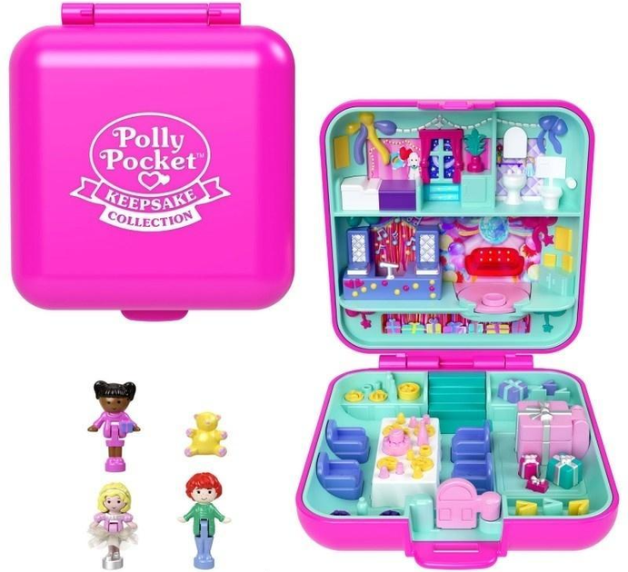 Wewnątrz kompaktu znajduje się tematyczna scena świętowania: miniaturowe mebelki, elementy dekoracyjne, akcesoria urodzinowe oraz trzy mikrolaleczki, w tym Polly i jej przyjaciele. W zestawie znajduje się także figurka misia, zdejmowana spódniczka oraz inne elementy, które pozwalają tworzyć różnorodne scenariusze zabawy. Zestaw został zaprojektowany w charakterystycznym stylu Polly Pocket — z jasnymi kolorami, miniaturowymi detalami oraz interaktywnymi elementami, które można otwierać i poruszać.