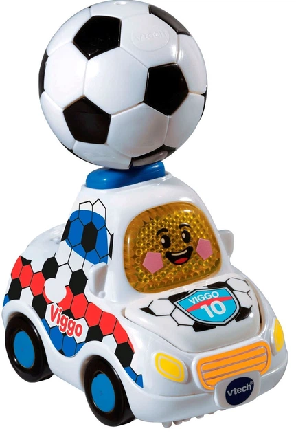 Naciśnij przycisk z migającą buźką, aby usłyszeć efekty dźwiękowe, zabawne frazy i śpiewane piosenki. Naciśnij przycisk akcji, aby otworzyć maskę i usłyszeć zabawne dźwięki. Przyjdź i zagraj w piłkę nożną z samochodzikiem Viggo Football Car! Działa na 2 baterie AAA (w zestawie).