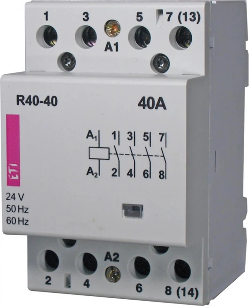 Модульний контактор ETI R 40-40 230 В — пристрій, призначений для керування ланцюгами з більшим навантаженням в електричних установках житлових, комерційних і технічних будівель. Модульна конструкція дозволяє монтаж на DIN-рейку та легку інтеграцію в низьковольтні розподільні пристрої.