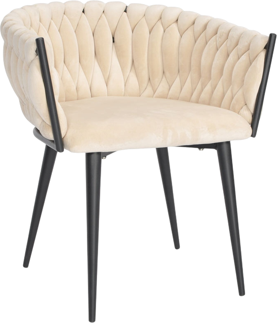 Wyróżnikiem modelu jest pleciona tapicerka 3D na oparciu, która wygląda jak dekoracyjne pikowanie i sprawia, że fotel przyciąga spojrzenia w jadalni, salonie czy przy toaletce. Kubełkowy kształt z podłokietnikami delikatnie otula sylwetkę, dzięki czemu siedzi się wygodnie także podczas dłuższych spotkań przy stole lub w strefie relaksu.
