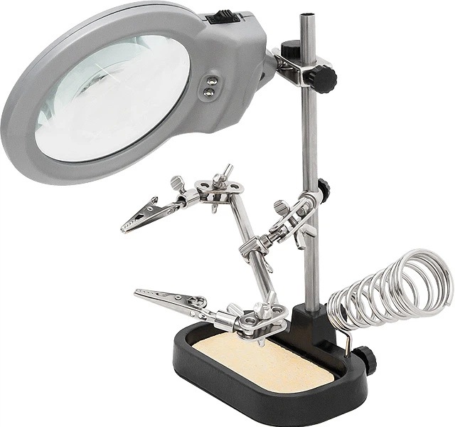 Zestaw narzędzi ułatwiający lutowanie oraz inne precyzyjne czynności instalatorskie i elektroniczne. W podstawie znajduje się gąbka do czyszczenia grotu oraz solidny uchwyt na lutownice. Do wykorzystanie są także dwa uchwyty "krokodylki" oraz szeroka lupa z możliwością podświetlenia. Duże możliwości konstrukcyjne umożliwiają dostosowanie ustawień do własnych potrzeb. Idealnie sprawdzi się również podczas takich pracy jak klejenie lub modelarstwo, wszędzie tam gdzie potrzebna jest precyzja i dokładność.