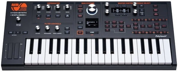 Syntezator ASM Hydrasynth Explorer to przenośny, 8-głosowy polifoniczny instrument z tablicą falową, 37-klawiszową klawiaturą i polifonicznym aftertouch, zaprojektowany dla muzyków, którzy chcą pełnej mocy Hydrasynth w kompaktowym formacie. Jego silnik dźwiękowy zbudowany jest z trzech oscylatorów na głos, oferując szeroki zakres przebiegów i możliwość płynnego morphingu. Wyposażony jest w moduł Mutators, który obsługuje falowanie, modulację PWM, FM, twardą synchronizację i inne złożone metody kształtowania tonu. Instrument posiada dwa filtry, które można łączyć szeregowo lub równolegle, w tym modele inspirowane klasycznymi układami analogowymi, co zapewnia szeroki zakres kontroli tonalnej. Zaawansowana matryca modulacyjna z 32 slotami, pięć generatorów obwiedni, pięć generatorów LFO i elastyczne routingi umożliwiają precyzyjną kontrolę nad każdym aspektem brzmienia. Wbudowane efekty obejmują pogłos, delay, chorus, flanger, phaser, kompresor i distortion, co pozwala na kształtowanie brzmienia bez konieczności zewnętrznego przetwarzania. Dzięki obsłudze MPE, polifonicznemu aftertouch, wyświetlaczowi OLED, intuicyjnemu panelowi sterowania i zasilaniu bateryjnemu Hydrasynth Explorer łączy w sobie profesjonalne możliwości z mobilnością, co czyni go wszechstronnym narzędziem do studia, sceny i podróży.