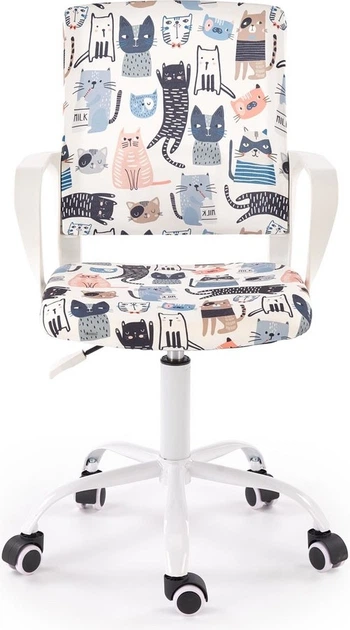 ORIS — nowoczesny fotel młodzieżowy, przeznaczony do pokoju dziecięcego lub młodzieżowego. Posiada metalową podstawę oraz zwykłe kółka ułatwiające przemieszczanie. Siedzisko i oparcie wykonane z czarnej tkaniny ozdobionej uroczymi kotkami, co nadaje fotelowi wyjątkowego charakteru i sprawia, że staje się ulubionym miejscem do nauki i odpoczynku.