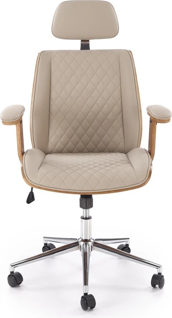 TIMBER — nowoczesny fotel gabinetowy z klasycznymi akcentami, przeznaczony do biura lub gabinetu. Posiada solidną aluminiową podstawę oraz kółka kauczukowe, które zapewniają płynne przemieszczanie bez ryzyka uszkodzenia podłogi. Siedzisko i oparcie wykonane z ekoskóry oraz giętej sklejki w kolorze beżowym, co nadaje elegancki wygląd i komfort.
