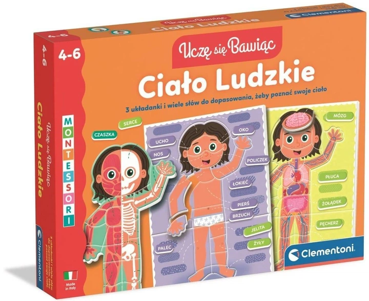 Ta edukacyjna gra została stworzona z myślą o dzieciach w wieku od 4 do 6 lat i w przystępny sposób przybliża im budowę ludzkiego ciała — zarówno zewnętrzną, jak i wewnętrzną. Układając trzy plansze-puzzle w ramkach, dziecko poznaje ciało, mięśnie, szkielet oraz narządy wewnętrzne.