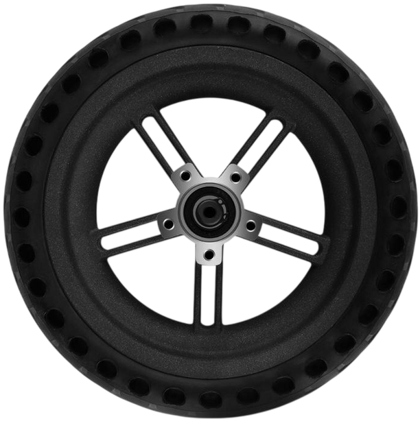 Przedstawione koło składa się z czarnej, wytrzymałej opony wykonanej z trwałego materiału gumowego. Cechą charakterystyczną tej opony jest wzór w kształcie plastra miodu, który nie tylko nadaje jej niepowtarzalny wygląd, ale także pełni funkcję systemu amortyzacyjnego. Otwory w oponie zapewniają pewną elastyczność, co sprawia, że jazda na hulajnodze jest bardziej komfortowa nawet na nierównych powierzchniach.