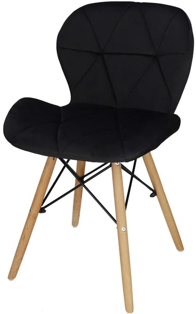 Siedzisko oraz oparcie są w pełni tapicerowane miękkim materiałem przypominającym welur, który jest przyjemny w dotyku i prezentuje się bardzo estetycznie. Pikowane oparcie podkreśla dekoracyjny styl krzesła, jednocześnie zwiększając komfort siedzenia. Stabilna konstrukcja oparta na drewnianych nogach wzmocnionych metalowym stelażem zapewnia trwałość oraz bezpieczeństwo użytkowania.