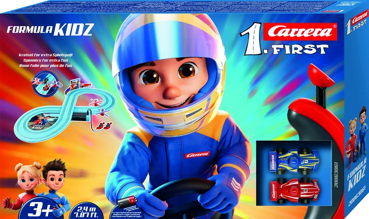 Z zestawem Carrera FIRST Formula Kids fascynacja sportem motorowym zaczyna się już w pokoju zabaw. Starannie zaprojektowany tor z niebieskimi szynami i kolorowymi elementami dekoracyjnymi pozwala małym kierowcom Carrera w pełni zanurzyć się w emocjach wyścigu. Wykonany w poręcznej skali 1:50, zachwyca łatwą obsługą i zasilaniem bateryjnym, dzięki czemu idealnie nadaje się do zabawy w podróży. Elektroniczne kontrolery ręczne, zaprojektowane specjalnie dla małych rączek, sprawiają, że jazda jest prosta i intuicyjna. Zintegrowany kręcioł zapewnia dodatkową frajdę na każdym okrążeniu. Z dwoma samochodami – Fireflash i Thunderbold – dzieci mogą przeżyć swoje pierwsze ekscytujące pojedynki, pełne frajdy z jazdy, radości i wyobraźni.