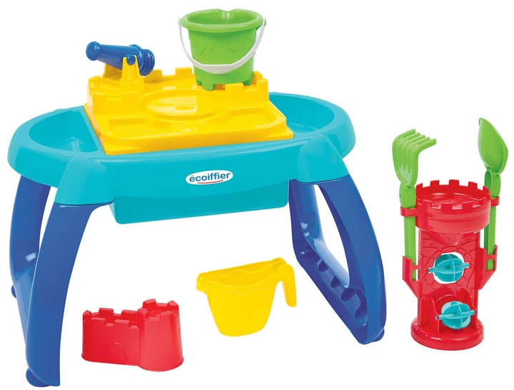 Ecoiffier Stół do zabawy z piaskiem i wodą z wieżą zamkową — kolorowy i funkcjonalny stolik do zabawy na świeżym powietrzu dla najmłodszych. Produkt ma 3 komory do zabawy piaskiem i wodą oraz zamkową wieżę, która zachęca dzieci do przelewania, przesypywania i odkrywania zabawy sensorycznej z wodą i piaskiem. W zestawie znajdują się różne akcesoria takie jak: łopatka, grabki, wiaderko, konewka, sitko i foremka w kształcie zamku, co dodatkowo wzbogaca zabawę.