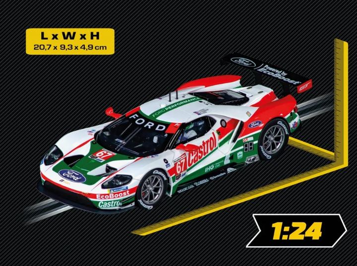 FORD GT Race Car "No.67" to nowoczesny następca legendarnego GT40, stworzonego z myślą o podboju długodystansowych serii, takich jak FIA WEC czy 24h Le Mans. Bolid z numerem 67 odnosił sukcesy w klasie GTE Pro, łącząc futurystyczny design z niezwykłą wydajnością aerodynamiczną. To auto stało się symbolem powrotu Forda do najwyższej ligi wyścigów, zdobywając uznanie dzięki szybkości, niezawodności i widowiskowej sylwetce, która nawiązuje do klasycznych tradycji GT40.
