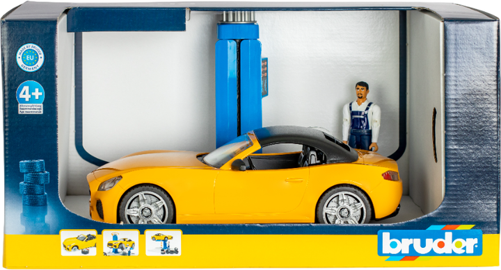 Zestaw zawiera sportowy rodster Bruder z zdejmowanym dachem i systemem szybkiej wymiany kół, co dodaje jeszcze więcej realizmu i radości z zabawy.