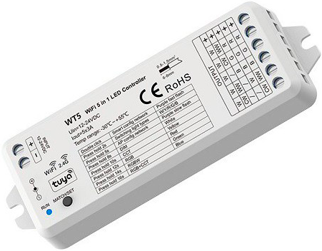 TUYA WT5 to 5-w-1 sterownik LED stałonapięciowy przeznaczony do systemów 12–24V DC, kompatybilny z taśmami i oprawami LED: