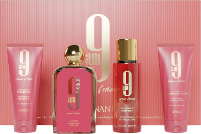 Zestaw prezentowy Afnan 9 AM Pour Femme stworzony dla nowoczesnej, kobiecej i pewnej siebie kobiety. Zestaw łączy wodę perfumowaną oraz kompleks kosmetyków do pielęgnacji ciała z jednym unikalnym zapachem, co czyni go idealnym zarówno na prezent, jak i do codziennego użytku.