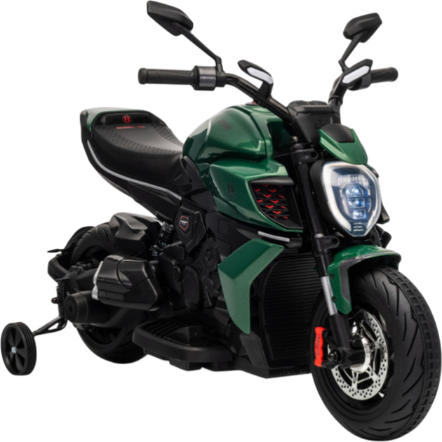 Motocykl elektryczny dla dzieci LEAN Toys Ducati Diavel V4 XMX656 w zielonym kolorze to dynamiczny model inspirowany sportowym designem. Smukła sylwetka, szerokie koła i dopracowane detale nadają pojazdowi realistyczny wygląd, który przyciąga uwagę i zachęca do aktywnej zabawy.