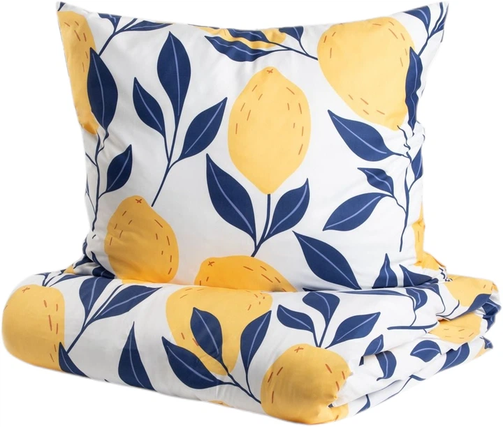 Komplet pościeli Homla Ec Sidrum to wyjątkowy zestaw, który wprowadza do sypialni energię i świeżość dzięki wyrazistemu wzorowi cytryn na tle głębokiego granatu. Kontrastujące kolory i letnia, soczysta kompozycja nadają wnętrzu charakteru, a miękka i przyjemna w dotyku mikrofibra zapewnia komfortowy sen oraz łatwość w codziennej pielęgnacji. Pościel łączy estetykę z praktycznym zastosowaniem, tworząc inspirującą i radosną aranżację łóżka.