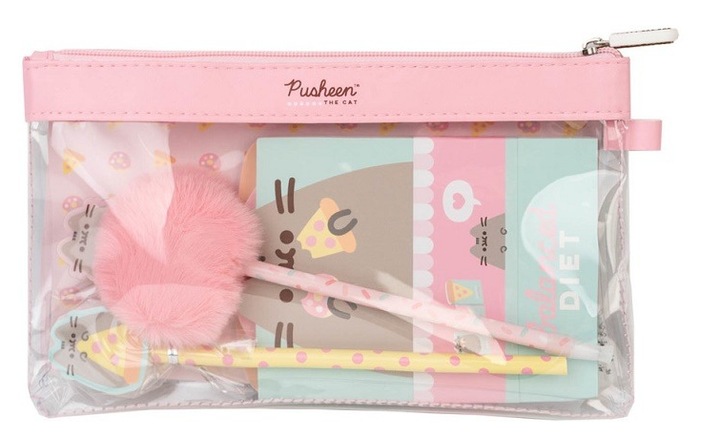 Шкільний набір Pusheen — це повний набір канцелярського приладдя з мотивом Pusheen, який містить практичні шкільні приладдя, необхідні для занять. Продукт має прозорий пенал на блискавці, в якому містяться приладдя. До складу набору входить ручка з плюшевим кінчиком, олівець з гумкою та три маленькі блокноти, ідеальні для запису нотаток та ідей. Все це було розроблено з урахуванням щоденного використання в школі і може бути також чудовою ідеєю для подарунка дитині. Розміри набору становлять приблизно 25 × 15 × 2 см, що робить його компактним і легким для перенесення.