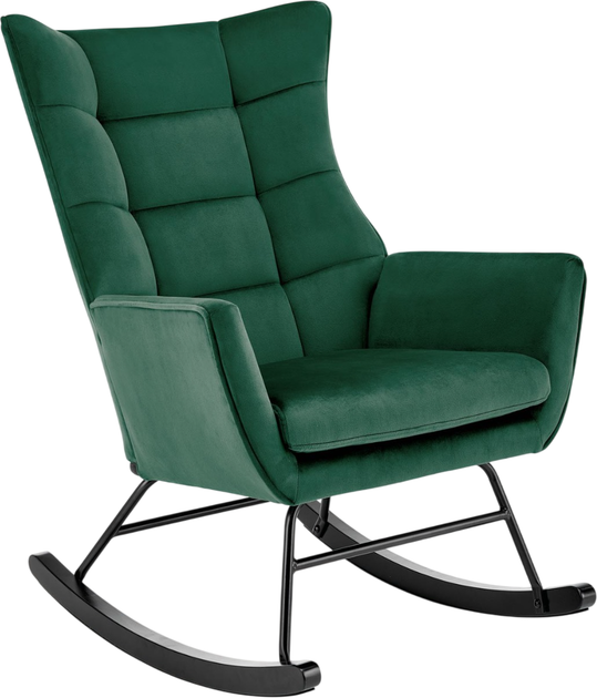 Fotel bujany w kolorze ciemnej zieleni to eleganckie połączenie nowoczesnego designu z klasycznym charakterem. Doskonale sprawdzi się w salonie, sypialni lub przytulnym kąciku do relaksu. Tapicerka z miękkiej tkaniny velvet nadaje mu wyjątkowej głębi koloru oraz subtelnej elegancji, a czarny metalowy stelaż podkreśla stylowy wygląd. Funkcja bujania zapewnia komfortowy odpoczynek i chwilę wyciszenia po intensywnym dniu. To idealna propozycja dla osób ceniących wygodę, estetykę oraz ponadczasowe rozwiązania do wnętrz.