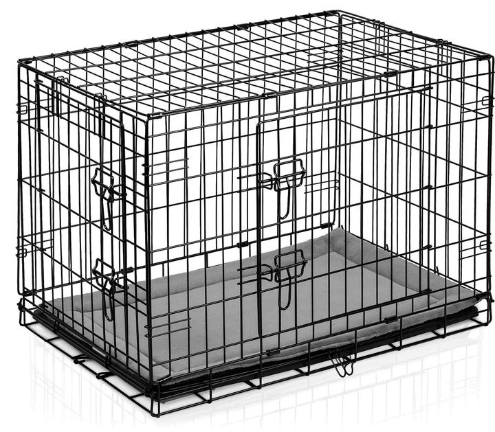 Klatka wyposażona jest w dwa wejścia — z przodu oraz z boku. Pozwala to na elastyczne ustawienie w pomieszczeniu i wygodny dostęp do wnętrza. Drzwi posiadają wzmocnione, zabezpieczone mechanizmy zamykania odporne na otwieranie przez psa.