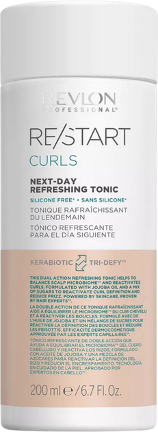 Tonik do włosów Revlon Professional ReStart Curls został stworzony dla włosów falowanych, kręconych i spiralnych, które potrzebują odświeżenia następnego dnia po myciu. Lekka formuła pomaga reaktywować loki, podkreślić ich kształt oraz zapewnia długotrwałą kontrolę puszenia się (frizz control). Dzięki zawartości oleju jojoba oraz mieszanki cukrów tonik odżywia włosy, dodaje im elastyczności, miękkości i naturalnego blasku, nie obciążając fryzury. Produkt jest wolny od silikonów i idealny do stosowania między myciami, aby utrzymać lśniące, sprężyste i zadbane loki.