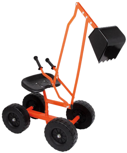 Koparka jest mobilna dzięki plastikowym kołom (średnica 20 cm), ma solidne siedzisko (wysokość siedziska około 35 cm) i może obracać się całkowicie w kółko.