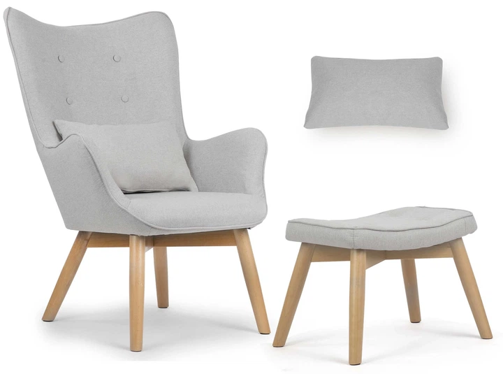 Підніжка дозволяє зручно покласти ноги, що робить цю модель ідеальним місцем для відпочинку з книгою або чашкою чаю. Букові ніжки крісла та підніжки оснащені фетровими підкладками, які захищають підлогу від подряпин.
