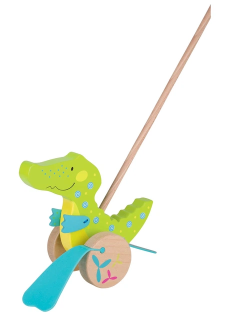 Wesoły zielony krokodyl z serii Susibelle z radością „kroczy” przed dzieckiem. Wystarczy popchnąć drewniany kijek, aby łapki zaczęły się poruszać i naśladować chodzenie. Zabawka ożywa podczas ruchu, zachęcając malucha do aktywnej zabawy.