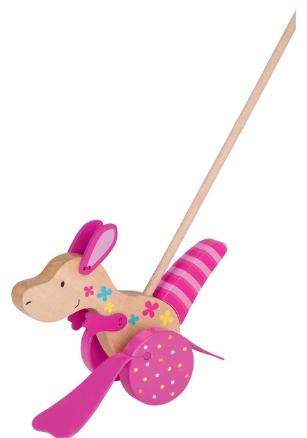 Różowy kangur z serii Susibelle wesoło „kroczy” przed dzieckiem, zamieniając każdy spacer w pełną radości zabawę. Wystarczy popchnąć drewniany kijek, aby łapki zaczęły się poruszać i imitować chodzenie.